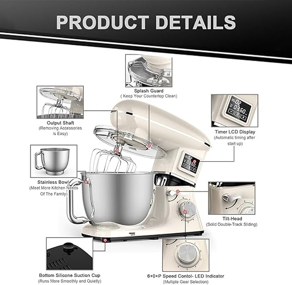 - Complete Set of Mixing Attachments: Elevate your baking game with the full set of mixing attachment accessories included with this standing mixer. The whisk, dough hook, and mixing beater are all crafted from durable stainless steel for long-lasting performance. The extra splash lid guard with an access hatch makes it easy to add ingredients without creating a mess on your countertop.Â