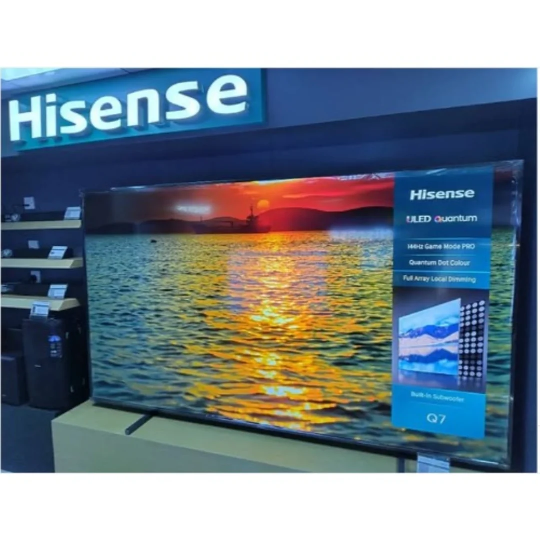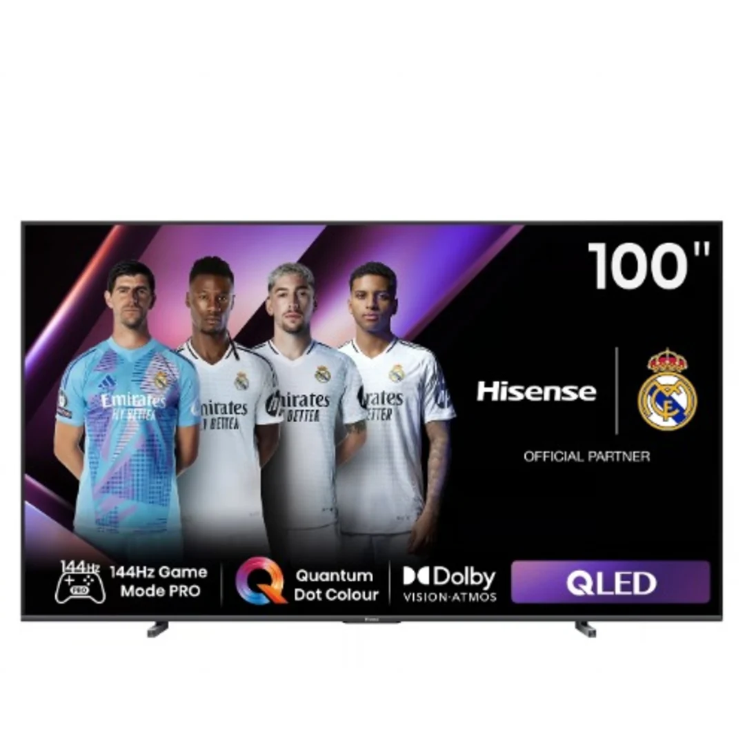 The Hisense TV 100Q7Q is a massive, 100-inch 4K QLED Smart Gaming TV that delivers a cinematic viewing experience with a high 144Hz refresh rate, Quantum Dot Color, and advanced audio technologies.
