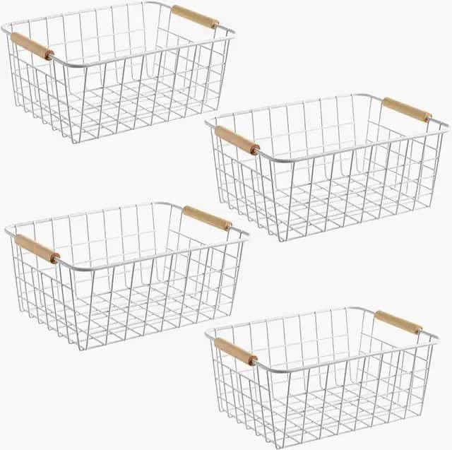 Sturdy multi-functional wire baskets with wooden handles, perfect for organizing any space with durability and style.