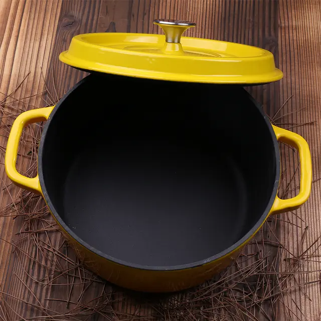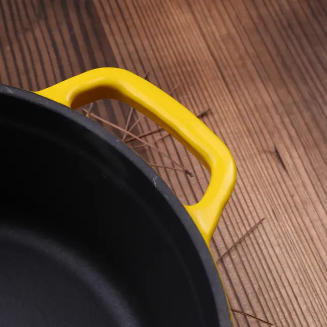 Yellow Enamel Cast Iron Cookware – Durable, scratch-resistant, and heat-resistant up to 500°C, ideal for slow cooking, browning, and stylish serving.